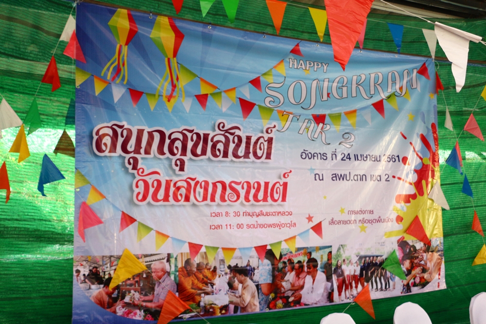 วันที่ 24 เมษายน 2561 สำนักงานเขตพื้นที่การศึกษาประถมศึกษาตาก เขต 2 จัดพิธีทำบุญสำนักงานเขตและงานรดน้ำดำหัว ขอพรผู้สูงอายุ โดยในภาคเช้าเป็นพิธีสงฆ์มีการตักบาตรข้าวสารอาหารแห้งแด่พระภิกษุ ต่อด้วยพิธีรดน้ำดำหัว ขอพรผู้สูงอายุ เนื่อในโอกาสเทศการวันสงกรานต์ประจำปี 2561