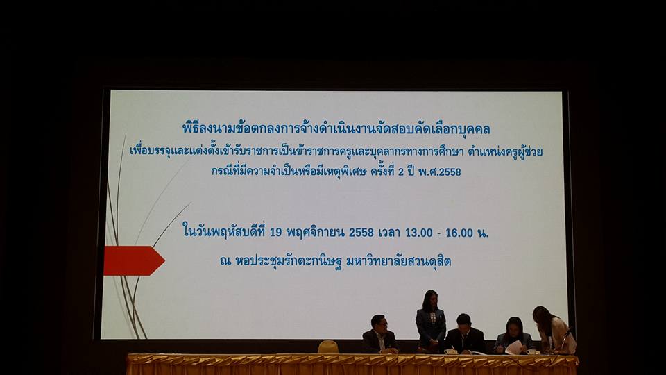 วันที่ 19 พฤศจิกายน 2558 นายสุทัศน์ ศรีดาเดช รอง ผอ.สพป.ตาก เขต 2 ร่วมพิธีลงนามข้อตกลงการจ้างดำเนินงานจัดสอบคัดเลือกบุคคลเพื่อบรรจุและแต่งตั้งเข้ารับราชการ เป็นข้าราชการครูและบุคลากรทางการศึกษา ตำแหน่งครูผู้ช่วย กรณีที่มีเหตุจำเป็นหรือมีเหตุพิเศษ ครั้งที่ 2 ปี 2558 ระหว่างสำนักงานเขตพื้นที่การศึกษาประถมศึกษาตาก เขต 2 กับมหาวิทยาลัยสวนดุสิต ณ ห้องประชุมรักตะกนิษฐ มหาวิทยาลัยสวนดุสิต กทม.